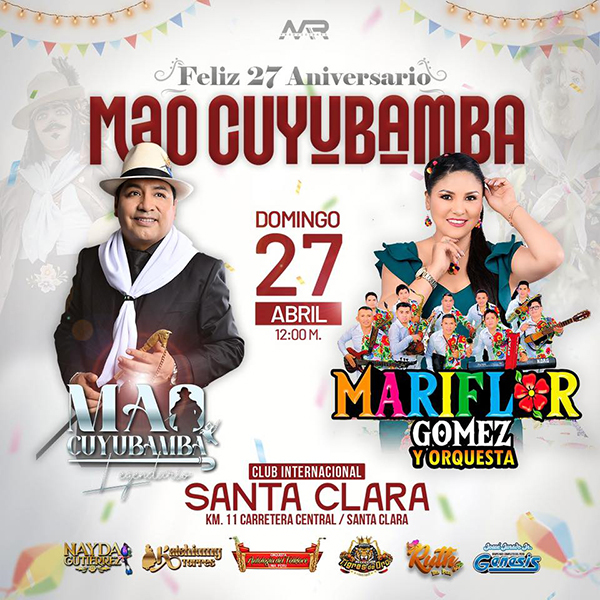 Presento la cartelera de excelentes artistas y orquestas que me acompañaran en esta celebración por mi 27 aniversario Artístico, anoten en la agenda será un día memorable.